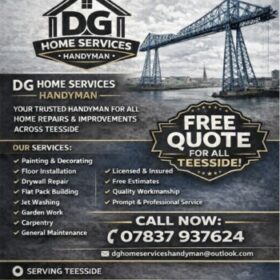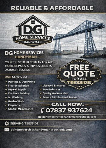 DG Homeservices 1 2 3 4 50.000 Handyman Services Bookmark Contact Information Stanmore avenue, Middlesbrough, Ts4 3eq 07837937624 dghomeserviceshandyman@outlook.com Detailed InformationFor all your household and commercial maintenance needs DG Homeservices Mrs